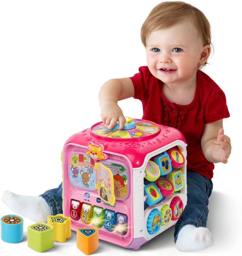 Give your child an interactive and educational toy with the VTech Sort and Discovery Activity Cube. This multi-functional toy is equipped with five sides of fun, including a shape sorter, sliding beads, piano keyboard, and more, which are designed to help develop fine motor skills and cognitive abilities.