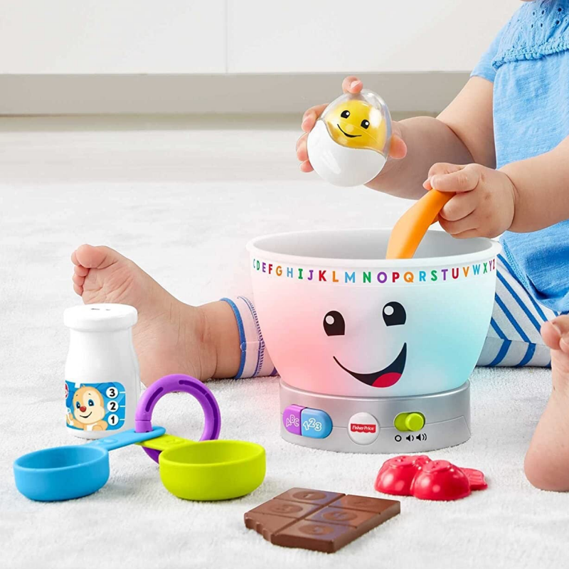 The Fisher-Price Mixing Bowl is a fun and interactive toy that is perfect for babies and toddlers ages 6-36 months. The light-up pretend mixing bowl comes with play ingredients for exciting baking play, and playful songs, sounds, and phrases introduce your baby to the alphabet, numbers, colors, and color mixing. Your little one can put and take the ingredients in the bowl for exciting lights, music, and sounds.